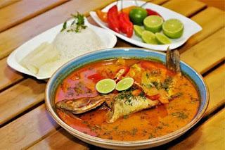 Потная рыба изготовлена из овощного жаркого, рыба вареная и «потеет» с бульоном и кокосовым молоком, что придает ей изысканный вкус.